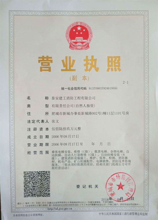 泰安建工消防工程有限公司,注冊成立于 2006 年8 月,注冊資金569 萬元。具有山東省公安廳消防局、山東省建筑工程管理局頒發的建筑消防設施貳級施工資質,2012 年9 月13日取得特種設備安裝改造許可證(電梯),2019 年5月取得建筑消防設施維修保養二級資質。是山東消防協會會員單位,2007 年6月被泰安市工商局命名為市級守合同重信用企業。 公司成立以來,一直奉行“質量第一,用戶至上,社會利益為先”的原則。公司在“重工程質量,創精品工程”的戰略方針指導下,已完成及目前在建的消防工程近百余項。公司下設工程部、技術部、維修部、財務部,工程技術專業人員 42 人。擁有一級、二級注冊建造師6 人,公司經理、技術負責人、財務負責人均具有高級專業職稱,所有技術人員均經省消防局或省建管局專業培訓并持證上崗。主要從事建筑消防設施施工、維護、保養、檢測;乘客電梯、載貨電梯、雜物電梯、自動扶梯、安裝、維修;消防器材、機電產品、礦山機械配件、電梯銷售;消防技術咨詢服務。